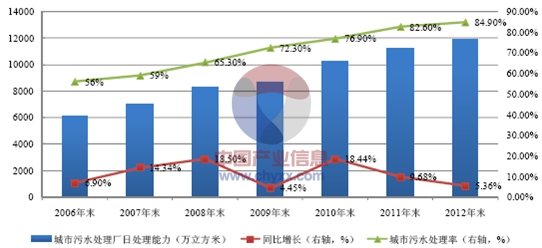 為防治水污染、緩解水資源短缺,近年來國家大力實施節能減排政策,中央和各級地方政府不斷加大對城鎮污水處理設施建設的投資力度,同時積極引入市場機制,建立健全政策法規和標準體系,城鎮污水處理行業發展迅速。2006 年末,我國城市污水處理廠日處理能力僅有6,122 萬噸,而到2012 年末,我國城市污水處理廠日處理能力已達11,858 萬噸,年均復合增長達11.65%;同時,城市污水處理率也從2006 年的56%增長至2012 年的84.9%,城市污水處理能力獲得大幅提升。