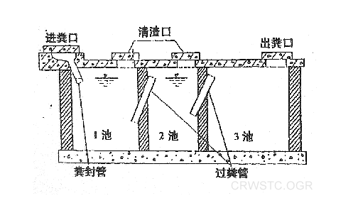 新鮮糞便由進糞口進入第一池,池內糞便開始發(fā)酵分解、因比重不同糞液可自然分為三層,上層為糊狀糞皮,下層為塊狀或顆狀糞渣,中層為比較澄清的糞液。在上層糞皮和下層糞渣中含細菌和寄生蟲卵最多,中層含蟲卵最少,初步發(fā)酵的中層糞液經過糞管溢流至第二池,而將大部分未經充分發(fā)酵的糞皮和糞渣阻留在第一池內繼續(xù)發(fā)酵。流入第二池的糞液進一步發(fā)酵分解,蟲卵繼續(xù)下沉,病原體逐漸死亡,糞液得到進一步無害化,產生的糞皮和糞 厚度比第一池顯著減少。流人第三池的糞液一般已經腐熟,其中病菌和寄生蟲卵已基本殺滅。第三池功能主要起儲存已基本無害化的糞液作用。的作用