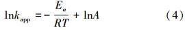 式中,Ea為反應的表觀活化能(J · mol-1),R為氣體常數(8.314 J · mol-1 · K-1),A為指前因子(min-1).通過擬合,可計算出熱活化S2O2-8降解ATZ反應的表觀活化能為141 kJ · mol-1.