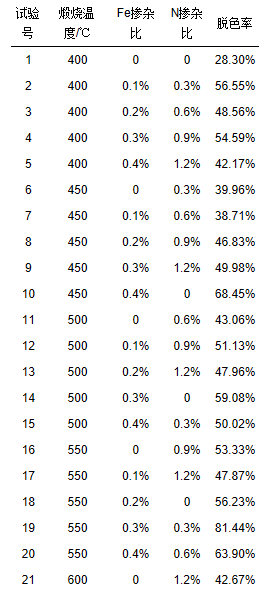 摻雜離子對TiO2改性能否成功很大程度依賴于摻雜離子種類、離子濃度配比及離子的分散程度等; 而煅燒溫度直接影響TiO2晶型結構、粒徑、比表面積, 進而影響摻雜電極的形貌和催化活性.對此, 實驗選取煅燒溫度、Fe3+摻雜比和N摻雜比3個影響因素, 各取5個水平, 設計L25(53)正交試驗, 具體方案見表 1.不同因素條件對應的水平取值主要是參考文獻報道來確定.