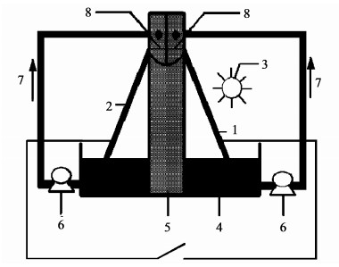 圖 1 斜置雙極液膜光催化反應器示意圖(1.Fe, N-TiO2/Ti陽極; 2.陰極; 3.光源; 4.反應池; 5.儲液池支架; 6.蠕動泵; 7.廢水流動方向; 8.儲液池)