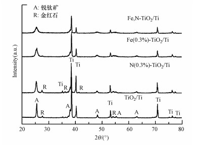 共摻雜電極的XRD分析結果見圖 2, 與標準XRD圖譜(見標準卡JCPDS No.21-1272和No.21-1276)對比可知, 未摻雜TiO2電極主體為銳鈦礦相, 有少量的金紅石相產生; 與未摻雜電極相比, 發現N摻雜對晶型結構的影響不大, 只使衍射峰的強度有所減弱, 而經過Fe摻雜后, Fe-TiO2/Ti和Fe, N-TiO2/Ti有效地抑制金紅相的生成, Fe, N-TiO2/Ti電極的銳鈦礦衍射峰強度進一步減弱, 半峰寬明顯增強.由Scherrer公式可知, 共摻雜TiO2膜電極的晶粒尺寸最小(表 3), 說明Fe、N共摻雜抑制了催化劑晶粒的生長, 阻礙了金紅石相的生成, 對光催化活性起到了促進作用.
