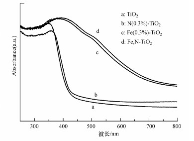 圖 3為各摻雜催化劑的UV-Vis DRS光譜圖.由圖可見, 與純TiO2相比, N摻雜TiO2(N-TiO2)在紫外區的光吸收有所減弱, 可見光區的光吸收略有增強, 但紅移并不明顯.原因可能是煅燒過程中N以摻雜方式進入TiO2較少, 高溫煅燒下易對N摻雜TiO2可見光吸收性能起阻礙作用(Ihara et al., 2004); Fe摻雜TiO2(Fe-TiO2)的吸收帶邊出現明顯紅移, 且Fe, N共摻雜TiO2(Fe, N-TiO2)紅移進一步提高, 紫外光區和可見光區的吸光性能進一步增強, 說明Fe、N均已進入TiO2晶格之中.Fe摻雜引入了雜質能級并形成雜質能帶(Dong et al., 2004), 使光生電子躍遷到導帶所需的能量比本征吸收帶小, 能量較小的光子也可以激發光生電子發生躍遷; 而N摻雜使N2p軌道與TiO2中O2p軌道發生重疊形成新的價帶, 表現出光響應范圍增大, 光譜紅移.