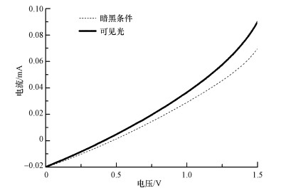 采用三電極體系, 以Fe, N-TiO2/Ti為工作電極, 飽和甘汞電極為參比電極, Pt電極為輔助電極, 在石英反應器中利用電化學工作站以掃速10 mV·s-1掃描Fe, N-TiO2/Ti在莧菜紅染料中的伏安(I-V)曲線, 結果見圖 4.圖 4結果表明, 該電極在可見光下有光電響應.