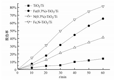 圖 5為Fe、N共摻雜與單摻雜、未摻雜電極降解效果對比圖, 其中, 未摻雜TiO2的脫色率僅為13.90%, 說明莧菜紅在可見光下能發生光敏化降解, 但效率不高.相同條件下, N-TiO2/Ti脫色率僅為41.26%.由XRD可知, N的引入減小了粒徑, 增大了膜的表面積.同時, N摻雜也可維持電荷平衡, 改善催化劑的光穩定性; Fe, N-TiO2/Ti的脫色率為81.44%, 達到最高, 較Fe-TiO2/Ti提高了15.87%.從UV-Vis DRS和XRD中可以看出, Fe的摻入改善了TiO2的可見光吸收, 增強了電極對可見光的吸收能力, 并且進一步細化了粒徑, 抑制了金紅石相的形成; 并結合N摻雜的優點, 共同提高了光催化性能.