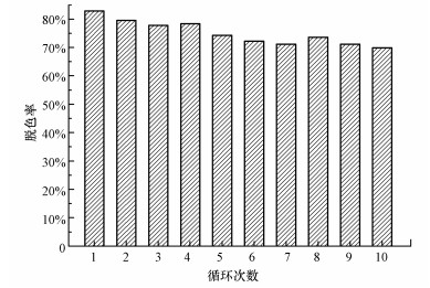 采用一片共摻雜電極反復對莧菜紅進行10次光催化降解實驗, 每次間隔采用去離子水沖洗、120 ℃烘干, 其脫色率與反應次數的關系見圖 10.隨著膜電極使用次數的增加, 電極的光催化降解效率略有下降, 第10次的脫色率比初次減小了12.99%, 平均脫色率維持在75.10%.表明催化劑負載牢固, 在循環液膜的沖洗下無明顯脫落, 具有較好的重復性.具體參見污水寶商城資料或http://m.xhxdt.com更多相關技術文檔。