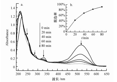莧菜紅UV-Vis光譜(圖 9a)顯示, 初始莧菜紅溶液共有216、237、277、332、521 nm 5個特征峰(216、237和277nm為萘環特征峰, 332 nm為—N=N—鍵特征吸收峰, 521 nm為偶氮鍵與萘環形成的大共軛體系的特征吸收峰).經光催化降解20 min后, 紫外光區的216、237、277和332 nm處的特征吸收峰已基本消失, 可見光區521 nm處的吸收峰迅速下降, 200 nm附近出現了新的吸收峰, 表明莧菜紅分子中偶氮鍵和萘環都遭到了破壞并生成了一些小分子有機化合物.反應80 min后, 可見光區的吸收峰基本消失, 溶液基本達到無色透明, 其脫色率達到91.6%, 但200 nm處出現吸收峰逐漸升高, 這可能是由于苯環結構生成的一些小分子有機酸產生的n-π*躍遷所致.
