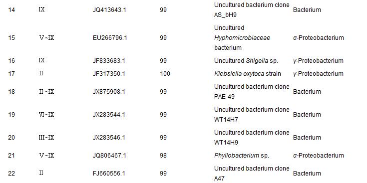對DGGE指紋圖譜的條帶進行回收測序分析,將測序結(jié)果與NCBI(National Center for Biotechnology Information,USA)數(shù)據(jù)庫中已知序列進行比對,確定各微生物的同源性及種屬,檢測到的微生物及其相關(guān)信息如表 3所示.經(jīng)比對鑒定,在SBMBR的9個污泥樣品中共檢測到22種微生物,其相似度大多在98%以上,其中屬于變形菌Proteobacterium的微生物有12種,分別屬于α綱(5種)和γ綱(7種),其余10種屬于未分類的Bacterium.