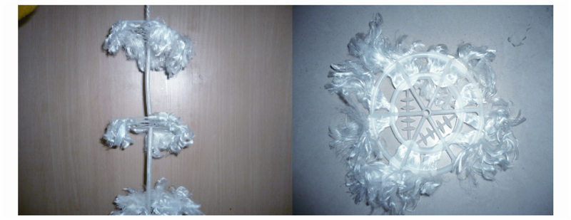 本試驗采用的組合式雙環(huán)填料由宜興市南泰水處理填料廠生產(chǎn),如圖 2所示. 其基本結(jié)構(gòu)是以雙圈大塑料環(huán)為骨架,負載著緊固的滌綸絲,內(nèi)圈是雪花狀塑料枝條. 填料單元直徑150 mm,纖維束長度160 mm,片距80 mm,密度1.02,抗拉強度6.8~7.1 g ·單絲-1,伸長率4%. 該組合填料具有疏水性,不但機械性能和化學性能優(yōu)良,抗生物降解,而且吸附能力和截留作用較強,可以有效地防止系統(tǒng)內(nèi)菌種的大量流失,同時 降低出水中懸浮物的含量.