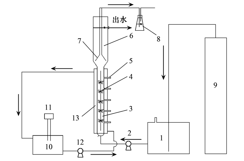 1.水箱; 2.蠕動泵; 3.反應區(qū); 4.組合式雙環(huán)填料; 5.取樣口; 6.沉淀區(qū); 7.三相分離器; 8.洗氣瓶; 9.氬氣罐; 10.熱水箱; 11.加熱及溫控系統(tǒng); 12.熱水循環(huán)泵; 13.水浴套管