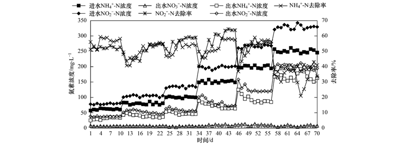 控制溫度為(30±1)℃,HRT=24 h,pH值為7.5~8.5,初始進水NH+4-N質(zhì)量濃度依次為60、 80、 100 mg ·L-1,之后以50 mg ·L-1的質(zhì)量濃度梯度逐步提高,同時保證ρ(NH+4-N)/ρ(NO-2-N)始終在1.32左右,每個工況穩(wěn)定運行7 d后進行下一濃度值的試驗,直至出水水質(zhì)明顯惡化后停止試驗. 試驗結(jié)果如圖 4和圖 5所示.