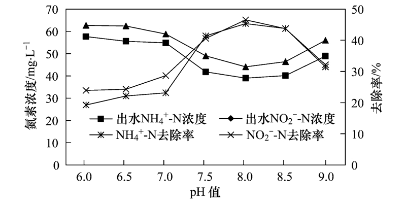 控制進水NH+4-N和NO-2-N質(zhì)量濃度分別在60mg ·L-1和80mg ·L-1左右,溫度為(30±1)℃,HRT=24 h. 以鹽酸和氫氧化鈉溶液依次調(diào)節(jié)pH值分別為6.0、 6.5、 7.0、 7.5、 8.0、 8.5和9.0. 試驗結(jié)果如圖 9所示.