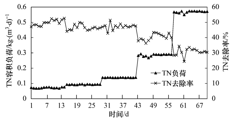 一方面,一定質(zhì)量濃度有機物的存在會引起自養(yǎng)ANAMMOX菌和異養(yǎng)反硝化菌之間對電子受體NO-2-N的競爭[25]. 由于ANAMMOX和反硝化反應的吉布斯自由能分別為-335 kJ ·mol-1和-472 kJ ·mol-1,反硝化過程更容易發(fā)生,同時反硝化菌的生長速率遠大于ANAMMOX菌. 因此,隨著C/N比的不斷升高,在爭奪反應基質(zhì)的過程中,反硝化菌的優(yōu)勢逐漸增強. 另一方面,反硝化過程因產(chǎn)堿引起反應體系的pH值升高,超出ANAMMOX菌生長代謝的最適pH值范圍,菌種的活性受到明顯的抑制[26]. 綜上所述,為了獲得最佳脫氮效果,應將C/N比控制在0.5左右. 3 最優(yōu)工況下ANAMMOX反應器的穩(wěn)定運行