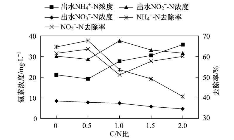 由圖 10和圖 11可以看出,在未添加有機物的情況下,NH+4-N和NO-2-N去除率分別為64.60%和61.54%. 當C/N比為0.5時,NH+4-N和NO-2-N去除率分別有所提高. 但當C/N比為1.0時,NH+4-N和NO-2-N去除效果開始明顯下降. 當C/N比大于1.5時,NO-2-N去除率呈升高趨勢,NH+4-N去除率則進一步大幅下降. 當C/N比為2.0時,NO-2-N去除率達到60.08%,而NH+4-N去除率僅為48.39%. 整個試驗階段,隨著C/N比的提高,COD去除率變化幅度較小,始終穩(wěn)定在25%~27%之間.