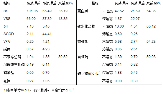 試驗污泥取自西安市某污水處理廠脫水污泥,該廠生物處理工藝為A2/O,試驗期間污水廠處于擴建階段,脫水污泥中剩余污泥的比例大于70%. 將脫水污泥用自來水稀釋至含固率10%作為試驗污泥. 試驗污泥主要指標為:TS 101.97 g ·L-1、 SS 101.05 g ·L-1、 VS 71.05 g ·L-1、 VSS 66.00 g ·L-1、 TCOD 93.56 g ·L-1、 pH 7.13、 VFA 0.25 g ·L-1. 泥樣于4℃ 冰箱保存待用.