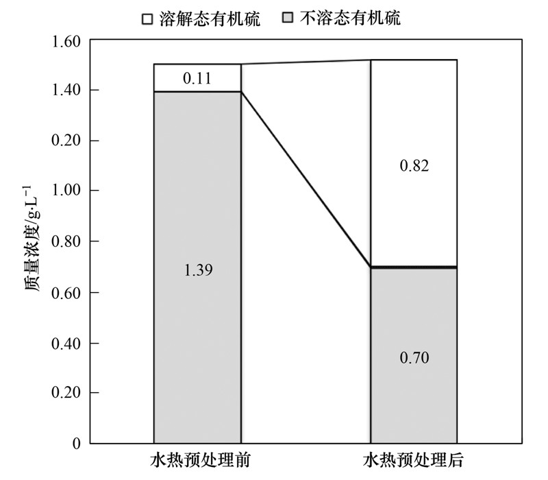 高含固污泥水熱預處理前、 后硫的轉化見圖 5. 水熱預處理前污泥中總硫質量濃度為1.50 g ·L-1,折合質量分數約為1.49%,一般城市污水處理廠污泥總硫質量分數為0.3%-2.3%[22]. 污泥總硫質量濃度在預處理前后基本保持平衡. 水熱預處理后溶解態總硫質量濃度由0.11 g ·L-1增至0.82 g ·L-1,不溶態有機硫的水解率為50.03%,含硫蛋白質中的有機硫可以有效從細胞中釋放并水解至液相.