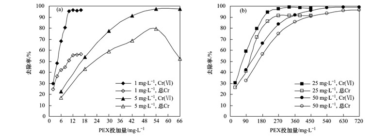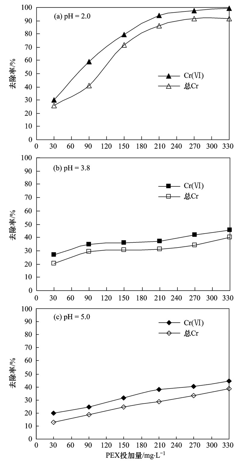 (2)pH值對PEX處理含鉻廢水影響較大,Cr(Ⅵ)和總Cr的去除率隨著體系中pH值的升高而明顯降低,在強(qiáng)酸條件下Cr(Ⅵ)和總Cr具有較高的去除效率.Cr(Ⅵ)和總Cr達(dá)到最高去除率時PEX投加量隨著Cr(Ⅵ)初始濃度的增加而增大,二者之間存在一定的化學(xué)計量關(guān)系.