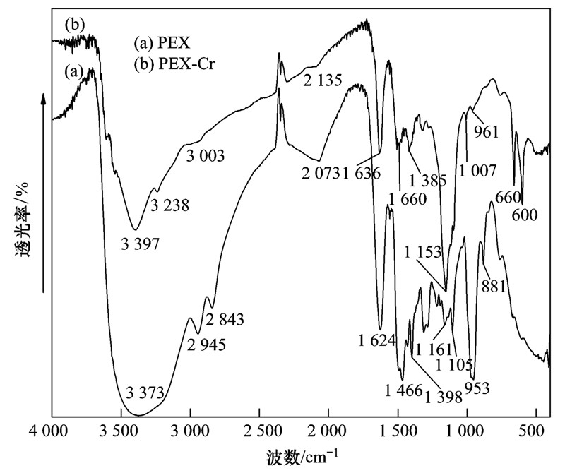 將PEX與Cr(Ⅵ)生成的螯合絮體PEX-Cr干燥處理,然后進(jìn)行紅外光譜分析,并與PEX的紅外光譜比較,結(jié)果見圖 5.