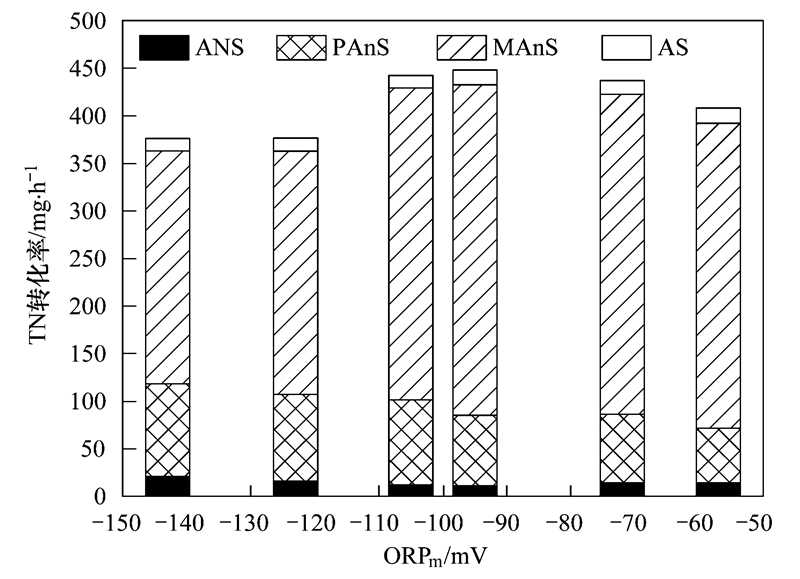 ORP 是表征污水處理系統環境條件的參數. 從微觀角度來說,活性污泥微生物群落結構、 優勢菌群的動態變化與其生存環境的ORP密切相關,即活性污泥中特定的優勢微生物有其適宜ORP 范圍[27]. 另有研究表明,調控ORP值可使微生物新陳代謝過程中的NADH/NAD+和NADPH/NADP+的含量發生改變,并激活某些關鍵酶,進而改變物質的代謝網絡,促使微生物沿著目標代謝途徑完成同化反應和異化反應[27]. 結合試驗結果,當ORPm設定值為-95 mV時,主缺氧段硝酸鹽氮和TN轉化量均達到峰值,說明該ORPm設定值在反硝化細菌適宜ORP范圍內,在此氧化還原條件下,硝酸鹽還原酶活性可得到最大程度地激活. 該值與Peng等的研究成果基本一致[19].