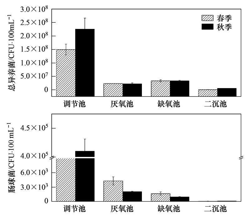 圖 1顯示了總異養(yǎng)菌和腸球菌在4個(gè)污水處理單元的去除效果. 調(diào)節(jié)池出水中總異養(yǎng)菌濃度(CFU ·100 mL-1)介于8.2~8.4 logs,腸球菌濃度(CFU ·100 mL-1)介于5.3~5.6 logs,這表明春季和秋季進(jìn)水中都有著豐富的異養(yǎng)菌和腸球菌.