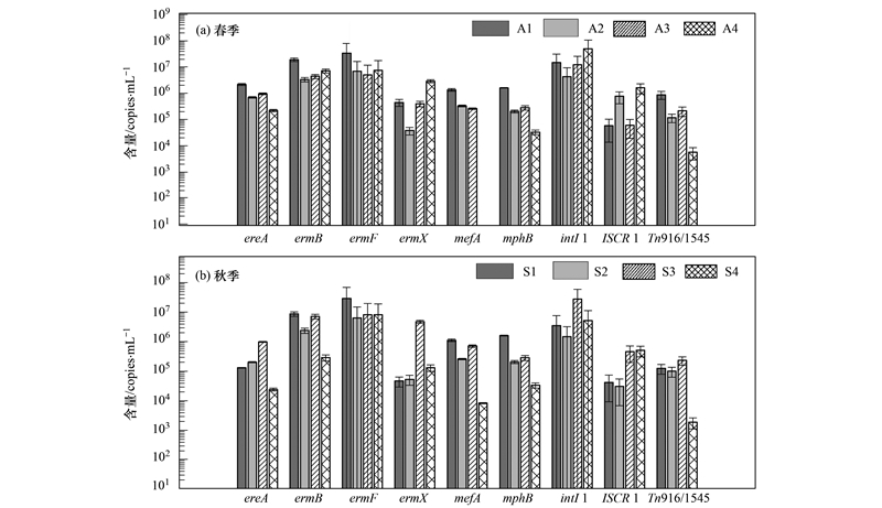 利用熒光定量PCR的方法檢測了大環(huán)內(nèi)酯類抗性基因ermB、 ermF、 ermX、 mefA、 ereA、 mphB和轉(zhuǎn)移元件ISCR1、 intI1、 Tn916/1545在4個(gè)污水處理單元中不同季節(jié)的分布特征和變化情況(圖 2). 從圖 2(a)中可知,春季進(jìn)水中抗性基因和轉(zhuǎn)移元件的濃度范圍為4.53×105~3.39×107 copies ·mL-1,二沉池出水中抗性基因的濃度范圍為0~7.53×106 copies ·mL-1,污水處理對抗性基因ermB、 ermF、 mefA、 ereA、 mphB和轉(zhuǎn)移元件Tn916/1545都有一定的去除效果,削減范圍為0.4~6 logs,抗性基因和轉(zhuǎn)移元件的削減效果依次為mefA>Tn916/1545> mphB> ereA> ermF>ermB,其中mefA在二沉池出水中未檢出,去除了6 logs,去除效果最好; 而ermX、 intI1、 ISCR1不但沒有被去除,反而出現(xiàn)了反彈. 如圖 2(b)中所示,秋季進(jìn)水中抗性基因和轉(zhuǎn)移元件的含量范圍為 4.17×104~2.95×107 copies ·mL-1,二沉池出水中抗性基因和轉(zhuǎn)移元件的含量范圍為1.86×103~8.19×106 copies ·mL-1,抗性基因ermB、 ermF、 mefA、 ereA、 mphB和轉(zhuǎn)移元件Tn916/1545有一定的去除效果,出水中下降了0.55~2.1 logs,其中mefA去除效果較好,下降了2.1 logs,而ermX、 intI1、 ISCR1出現(xiàn)了反彈.