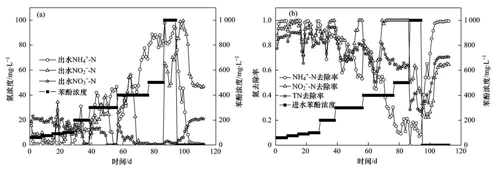 方法均參照文獻[16]. NH4+-N:納氏試劑分光光度法; NO2--N: N-(1-萘基)-乙二胺分光光度法; NO3--N: 紫外分光光度法; pH:哈納pH211型酸度計; 苯酚: 4-氨基安替比林直接光度法; MLSS 和MLVSS: 重量法; TN: 實驗環境為無機環境,因此以NH4+-N、 NO2--N和NO3--N三者之和表示TN.