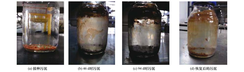 剛開始接種的ANAMMOX污泥,如圖 3(a)所示,顏色呈紅色. Strous等[23]研究表明,氨氧化細菌細胞內含有大量血紅素,當污泥顏色較紅時表明ANAMMOX污泥活性很好. 隨著苯酚的加入,反應到46 d后,反應器內出現絮狀物,污泥體積和顏色開始發生變化,紅色的污泥表層開始變為黑色絮狀,如圖 3(b)所示,此時苯酚對污泥產生了抑制[14]. 隨著苯酚濃度的增加,黑色絮狀向內擴增,表層的絮狀開始脫落,到第94 d,污泥只有核心的一點還呈現顆粒狀,但顏色仍為紅色,說明此時ANAMMOX污泥仍然具有活性,如圖 3(c)所示. 第95 d停止投加苯酚,改為加常規的營養液,經過18 d的修復后,污泥表層的黑色絮體逐漸變為紅色,污泥顏色部分恢復,如圖 3(d)所示. 此時NH4+-N的去除率得到恢復,但污泥量減少,部分微生物死亡,由于ANAMMOX菌時代周期較長(11 d),所以短期恢復無法使微生物量快速增加. 整個過程中,隨著NH4+-N去除率的變化污泥顏色會發生變化,因此可以將污泥的顏色作為視覺上評判ANAMMOX污泥活性受抑制程度的一個依據. 然而恢復后ρ(NO2--N)去除/ρ(NH4+-N)去除/ρ(NO3--N)生成平均值為1 ∶0.86 ∶0.2,與氨氧化理論化學計量比為1 ∶1.32 ∶0.26有很大差別. 猜測原因可能是當苯酚存在時反硝化細菌和ANAMMOX細菌競爭NO2--N,從而使ANAMMOX細菌在利用較少NO2--N時就可以發生反應,或者有新的微生物如自養細菌生成,可以直接降解NH4+-N. 但具體原因需要進一步去研究.