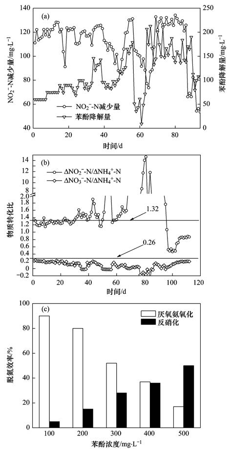 長期實驗結果表明,當苯酚濃度大于200 mg ·L-1時,體系中NH4+-N的去除率在下降,ANAMMOX菌的能力在減弱,而NO2--N的去除率不但沒有下降反而升高,甚至達100%,說明反應體系中存在著可以降解NO2--N的反應. Toh等[24]在用ANAMMOX工藝處理焦化廢水的研究中證實了ANAMMOX體系中存在反硝化菌,而賴楊嵐等[25]研究結果進一步表明,ANAMMOX菌能與反硝化菌共存,反應器可實現ANAMMOX與反硝化的協同作用. 因此在ANAMMOX體系中加入苯酚有可能發生以苯酚為有機碳源的反硝化反應,猜測NO2--N的過量去除與苯酚有關. 本實驗中反應體系中NO2--N的減少量與苯酚的降解量如圖 4(a)所示,隨著苯酚濃度的增加,體系中苯酚的降解量在增大,而此時NO2--N的去除量也相應增大,說明NO2--N的過量去除確實是由于苯酚導致的,且苯酚作為有機碳源參與了反應,也就是反硝化反應. 當苯酚濃度高于500 mg ·L-1時,由于體系中基質(NO2--N和NO3--N)有限,所以苯酚的降解量處于平穩狀態,此時反硝化菌的能力也達到穩定.
