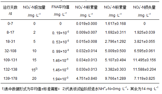 (1)FNA為0-1.46×10-3 mg ·L-1濃度范圍內,出水無NO2--N積累,NO3--N積累量隨著FNA投加量的增大而增多,總氮損失率均高于80%,NO2--N損失量由0 mg ·L-1升至11.495 mg ·L-1,FNA為1.94×10-3mg ·L-1時,系統內逐步出現NO2--N的積累.