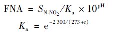 反應器每天運行3個周期,每周期8 h,包括2 h厭氧,5 h好氧及1 h沉淀、 排水、 閑置,試驗總共進行178 d,分為6個工況,各工況在厭氧結束,即好氧初始階段瞬時投加不同量亞硝酸鈉濃縮液,使混合液內NO2--N濃度分別為0、 2、 5、 10、 15、 20 mg ·L-1,相應的FNA濃度由公式: