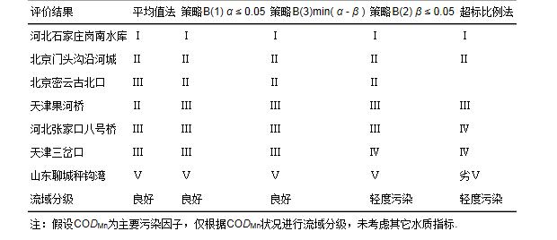 選擇海河流域的CODMn作為達標評價的對象,數據來源為環(huán)保部網站,收集2014年7月22日-2015年7月14日的周監(jiān)測數據,共有北京密云古北口(51)、北京門頭溝沿河城(51)、天津三岔口(51)、天津果河橋(51)、河北張家口八號橋(45)、河北石家莊崗南水庫(51)、山東聊城秤鉤灣(42)等7個監(jiān)測斷面,括號中為不同監(jiān)測斷面的有效監(jiān)測樣品數.