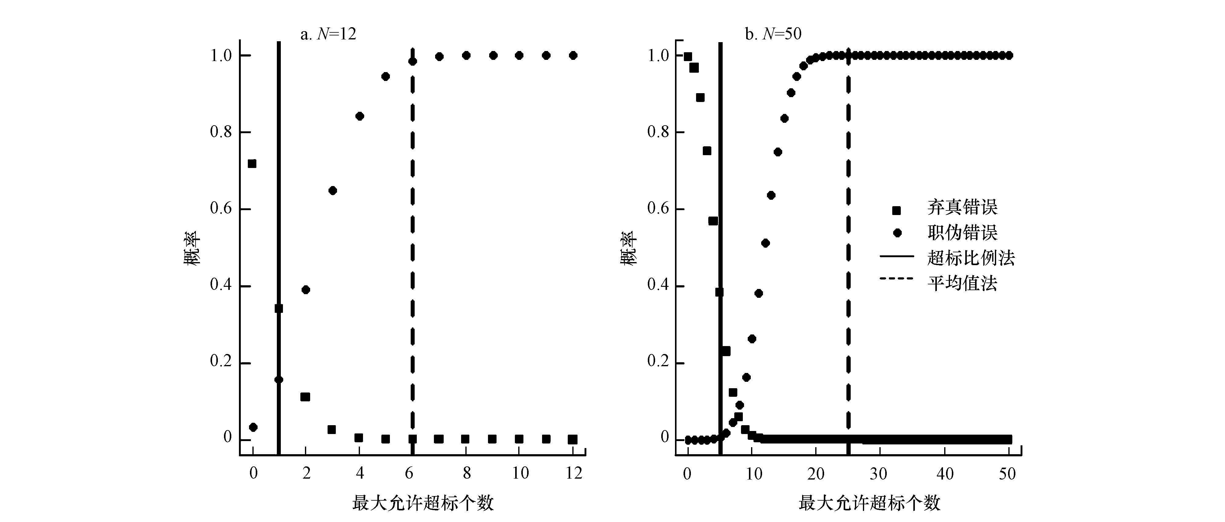 圖 1N=12(a)和50(b)時2類錯誤概率隨最大允許超標個數的變化