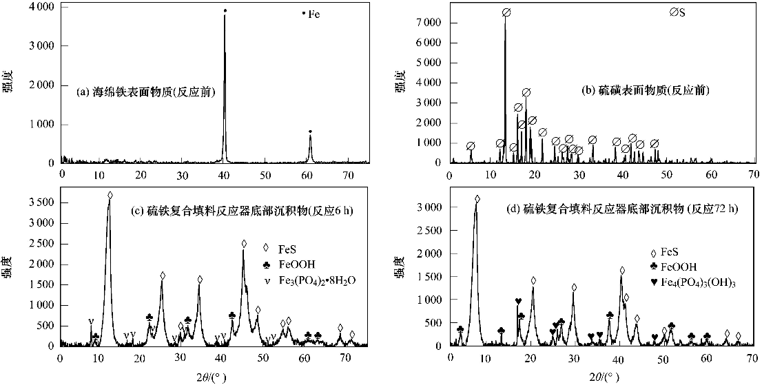 由圖 3可知,硫鐵復合填料反應器出水TFe濃度保持在1.0 mg·L-1以上,均高于單純海綿鐵和硫鐵炭復合填料. 由圖 4可知,反應前海綿鐵和硫磺表面主要成分分別為Fe、 S; 硫鐵復合填料反應6 h后沉積物主要FeS、 FeOOH和Fe3(PO4)2·8H2O,反應72 h后沉積物主要為FeS、 FeOOH和Fe4(PO4)3(OH)3,其中,FeOOH是海綿鐵腐蝕水解產物、 FeS是硫鐵填料反應產物,水中的PO43-分別生成Fe3(PO4)2·8H2O、 Fe4(PO4)3(OH)3沉淀去除.