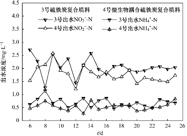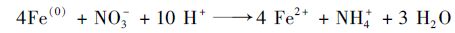 因此,在硫鐵復合填料體系中,海綿鐵腐蝕生成Fe2+、 Fe3+、 FeOOH和FeS是實現高效除磷的主要原因. 系統中海綿鐵的腐蝕途徑包括: ①單質鐵被水中的溶解氧氧化為Fe3O4和Fe2O3等物質; ②海綿鐵內部的碳與鐵構成微原電池持續促進海綿鐵腐蝕產生Fe2+,如反應方程式(1)、 (2)所示; ③零價鐵與硝酸鹽發生氧化還原反應生成Fe2+[11~13],如反應方程式(3)、 (4)所示,出水NO2--N、 NH4+-N濃度見圖 5; ④硫鐵填料之間的硫化反應又進一步促進海綿鐵的腐蝕.