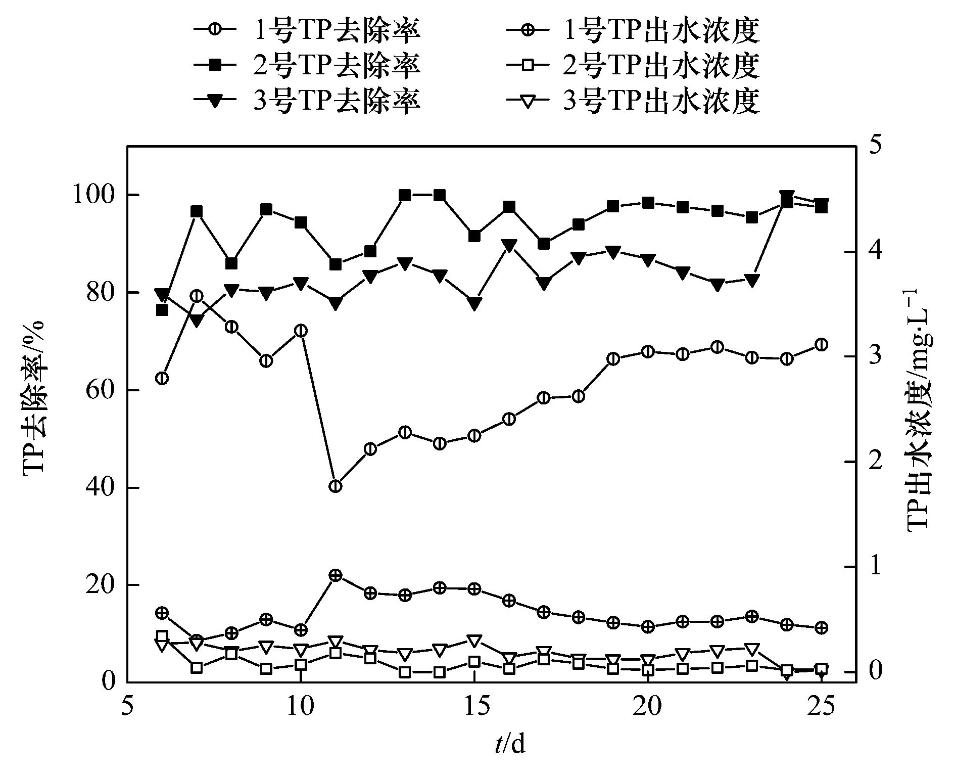 不同填料的除磷效果如圖 1所示. 從中可知,硫鐵復合填料反應器TP去除率在95%以上,分別比硫鐵炭復合填料、 單純海綿鐵填料高出8%和35%; 出水TP的含量在0.1mg·L-1以下,均低于硫鐵炭復合填料、 單純海綿鐵填料. 由此可見,硫磺可以高效地促進海綿鐵除磷過程,活性炭會影響硫鐵復合填料的除磷效果.