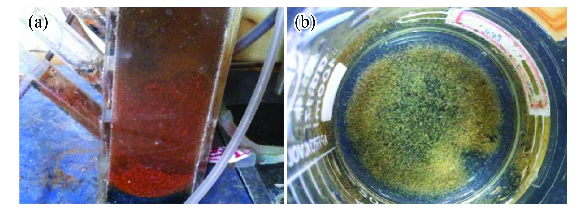 (a)反應器壁面附著大量絮狀物;(b)出水含大量絮狀物