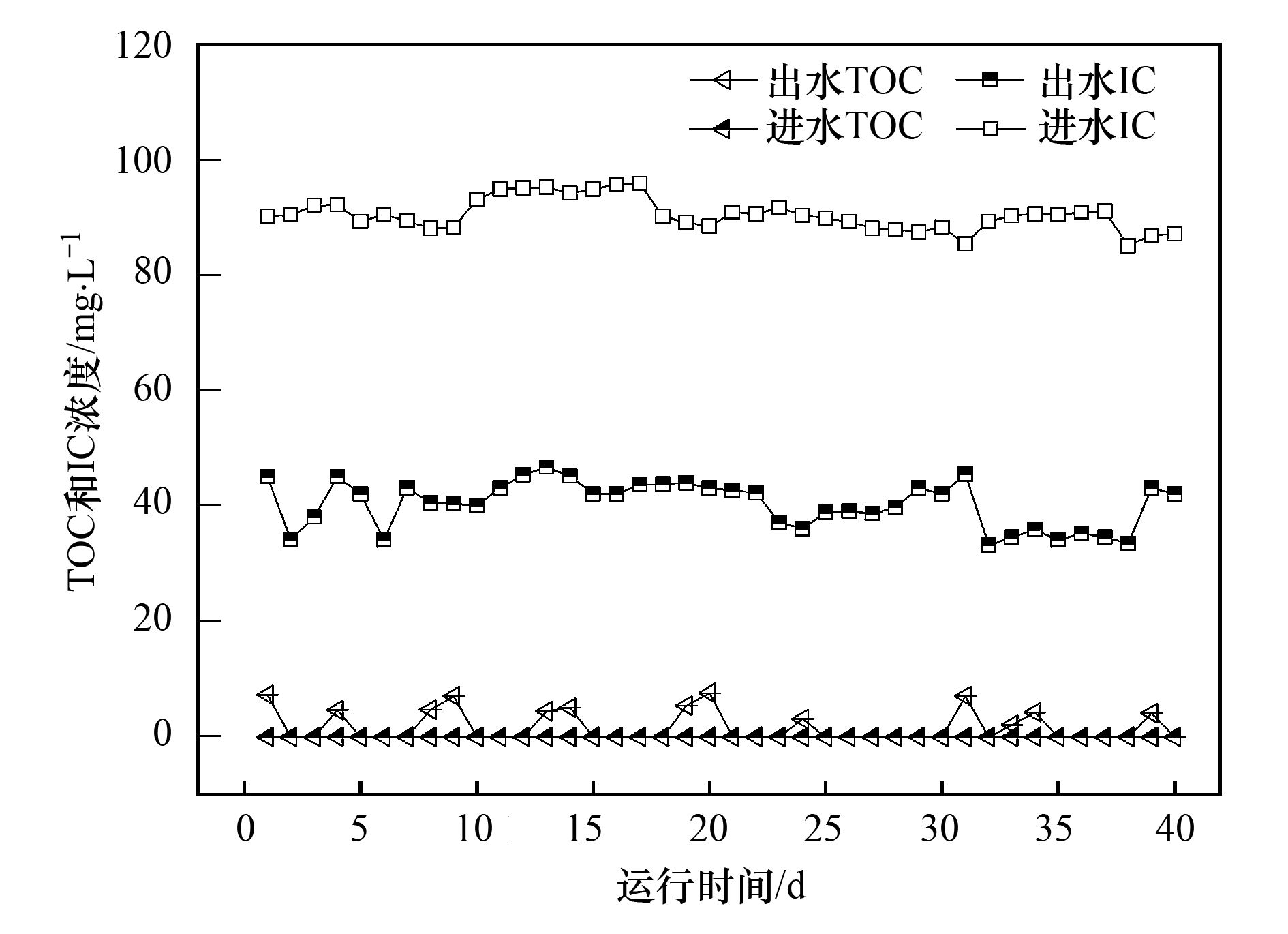 由圖 5可知,監測整個反應過程進出水溶解性有機碳(TOC)和無機碳(IC),進水IC為85.1~95.9 mg·L-1,出水IC為32.2~46.7 mg·L-1. 與此同時,整個反應過程中出水TOC始終小于3 mg·L-1.