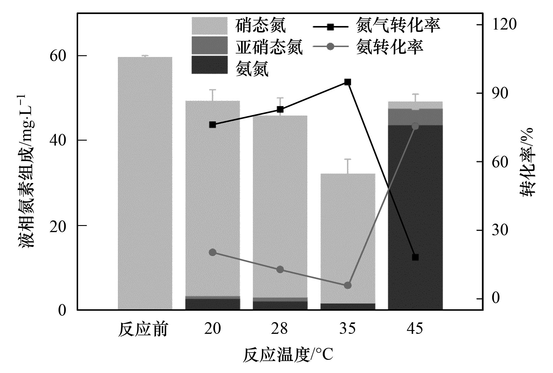 圖 7所示,在20~45℃條件下,厭氧氨氧化污泥對零價鐵還原硝酸鹽反應中產物的影響. 當溫度為20~35℃時,添加了厭氧氨氧化的零價鐵還原硝酸鹽體系中液相總氮損失的效率逐步升高,并且始終保持較高的水平(76.17%~94.84%). 當溫度為45℃時,液相總氮損失的效率急劇降低至18.12%. 厭氧氨氧化污泥對零價鐵還原硝酸鹽反應產物的影響在溫度為20~45℃時較大,而溫度超過其最適的生存范圍,并且化學反應更為強烈時,其還原產物主要為氨.