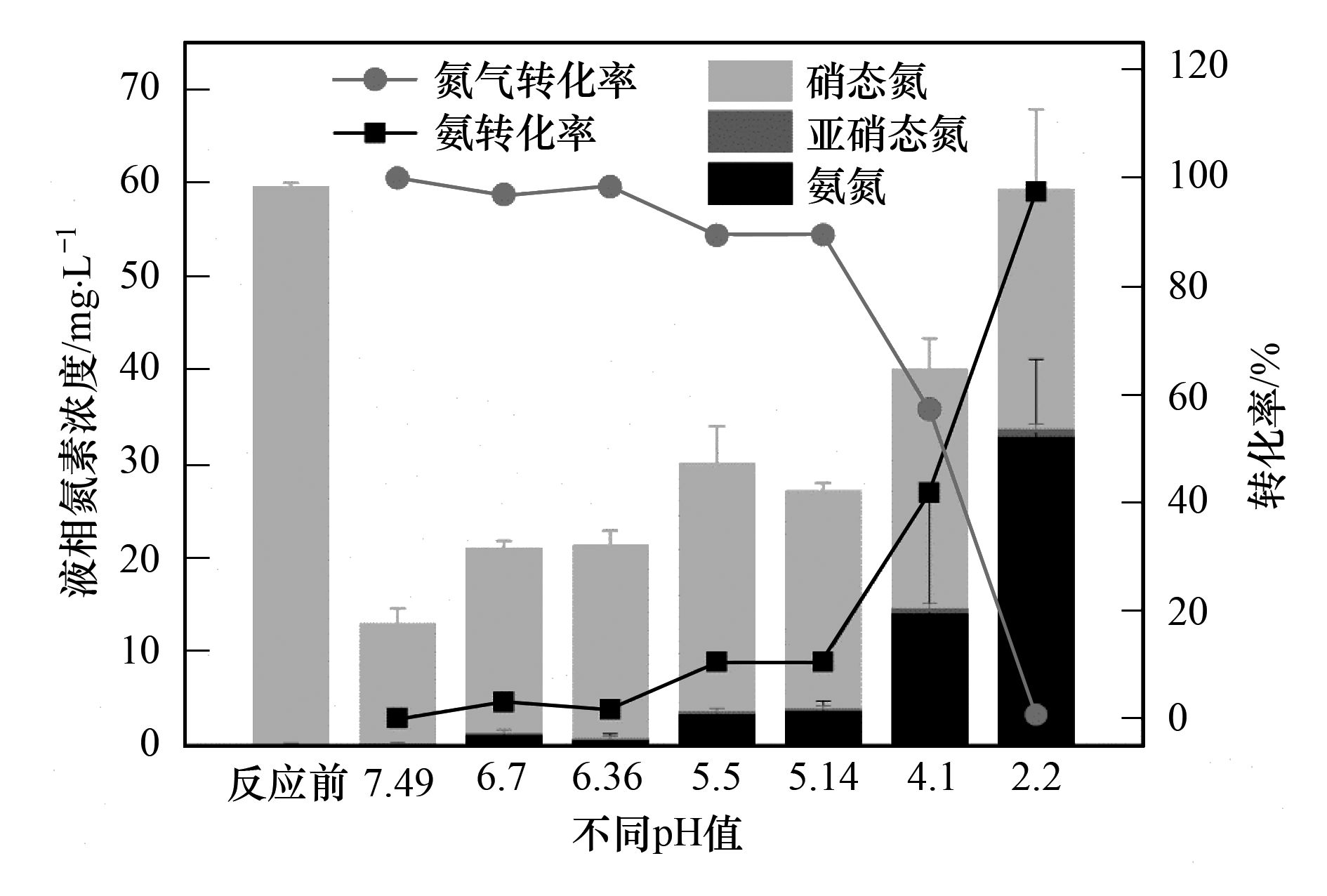 在pH值為2.2~7.5的范圍內,厭氧氨氧化污泥對零價鐵還原硝酸的產物的影響情況如圖 6所示. 從中可知,當pH值為7.49、 6.70、 6.36、 5.50、 5.14、 4.1、 2.2時,硝酸鹽的轉化量分別為46.61、 39.73、 38.89、 33.01、 36.24、 33.94、 33.91 mg·L-1. 隨著pH值由7.49降低至5.14,反應體系中液相總氮損失呈現出先緩慢降低. 而從5.14降低至2.2過程中,液相總氮損失率從89.41%快速降低至1.01%,此時隨著pH值的降低,液相逐漸出現氨氮,其轉化率從0%上升至97.44%.
