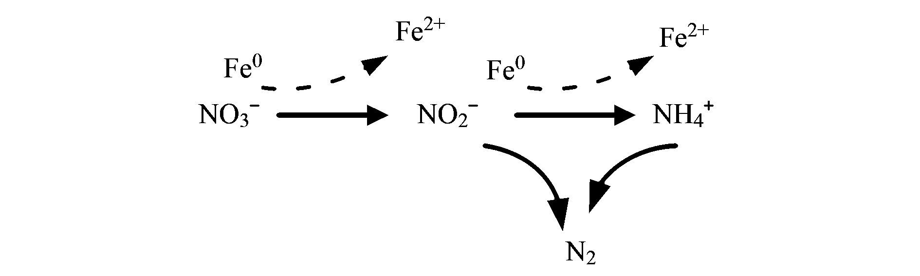 零價鐵(ZVI)具有較強的還原能力,在作為硝酸鹽還原材料的同時,還能修復高毒性有機物污染、 重金屬污染,是較為理想的水處理材料. 采用零價鐵修復地下水中的硝酸鹽在20世紀90年代早已被實際應用. 以零價鐵作為電子供體的氧化還原反應中,NO3-首先被還原為NO2-,并繼續還原為NH4+. 其中小部分的NO3-也可能被還原成N2. 零價鐵還原硝酸鹽反應過程中,轉化1 mol NO3-需要10 mol H+,因此這種硝酸鹽轉化難以在酸度貧乏的體系中持續進行. 零價鐵化學還原硝酸鹽的主要產物為氨,易形成二次污染. 這嚴重制約了零價鐵還原硝酸鹽的技術開發與應用.