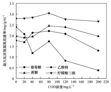 實(shí)驗(yàn)進(jìn)水NH4+-N和NO2--N濃度分別為80 mg·L-1和120 mg·L-1.考察4種有機(jī)物葡萄糖、蔗糖、乙酸鈉、檸檬酸三鈉在COD濃度梯度0、20、40、80、120、200 mg·L-1時對厭氧氨氧化反應(yīng)的影響.