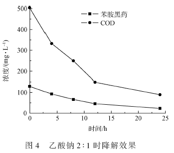 由圖4 可知,12 h 內(nèi)COD 均下降較快,乙酸鈉為微生物生長提供碳源,誘導(dǎo)降解苯胺黑藥關(guān)鍵酶的生成,活性較強(qiáng)的微生物在關(guān)鍵酶的作用下降解苯胺黑藥,反應(yīng)后期隨著乙酸鈉濃度降低,關(guān)鍵酶減少,苯胺黑藥的毒性顯現(xiàn),微生物活性下降,降解效率趨于穩(wěn)定。