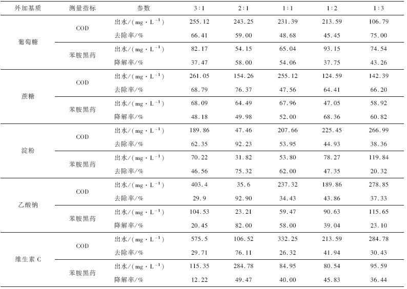 微生物共代謝是利用微生物降解難降解有機(jī)物的一種重要方式,外加基質(zhì)種類及濃度均是共代謝降解效果的影響因素。王淑紅等考察了外加葡萄糖、可溶性淀粉和乙酸鈉對(duì)微生物降解2,4,6-三硝基苯酚的影響,結(jié)果表明,外加碳源對(duì)2,4,6-三硝基苯酚的去除有一定幫助。實(shí)驗(yàn)考察不同比例不同外加基質(zhì)降解24 h 后出水效果,結(jié)果見表1。