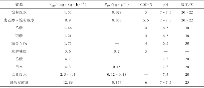 根據圖5 和以上公式可以計算出發酵液的反硝化性能參數VDN,Ss = 12. 89 mg·(g·h) - 1 和PDN =0. 174 g·g - 1 (COD)。VDN 代表的是反硝化過程中N的減少速率,PDN 代表的是活性污泥因消耗一定量的COD 而減少的N 的量。理論上,每轉化1 g NO3 -N成N2 需要2. 86 g COD ( PDN,理論值= 0. 35 g · g - 1(COD));但實際上系統中的碳源不僅需要用于反硝化過程的電子,還要為系統中的微生物的新陳代謝提供能源和能量,因此真正的PDN 值都應該小于理論值。表2 比較了一些化學有機物和工業廢水的反硝化性能參數,可以看出發酵液的VDN 和PDN 明顯優于很多化學有機物和工業廢水,由此可見短程發酵液具有高效的反硝化性能。