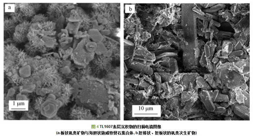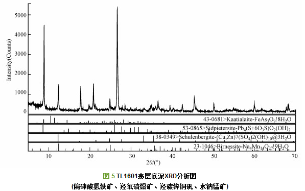 大寶山槽對坑、鐵龍尾AMD的表層沉積物中的礦物主要有4種類型:①各個采樣點均含有的風(fēng)化殘留礦物(石英、長石、云母)和風(fēng)化產(chǎn)物高嶺石等;②鐵的氫氧化物次生礦物:鈉伯爾礦、纖鐵礦、四方纖鐵礦、施威特曼石、二線水鐵礦、針鐵礦;③鐵礬類次生礦物:黃鉀鐵礬, 水鐵礬、葉綠礬、粒鐵礬、高鐵礬、砷鐵礬、纖鈉鐵礬等;④AMD中罕見的次生礦物:水鈉錳礦、羥氧硫鉛礦(Sidpietersite)、偏砷酸氫鐵礦(Kaatialite).