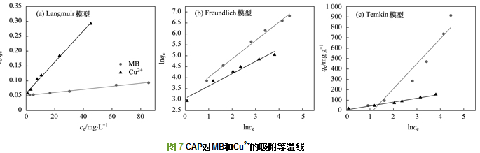 采用在25℃, 固液比為1 g ·L-1, 改變Cu2+的初始質量濃度分別為10、20、50、100、150、200 mg ·L-1, 改變MB的初始質量濃度分別為50、100、300、500、800、1 000 mg ·L-1, 轉速為150 r ·min-1下振蕩反應24 h, 過膜后分析濃度.計算吸附劑的吸附量.分別研究CAP的吸附等溫線變化規律. CAP對MB和Cu2+的吸附等溫線采用Langmuir、Freundlich、Temkin模型進行擬合, 其表達式分別如下:
