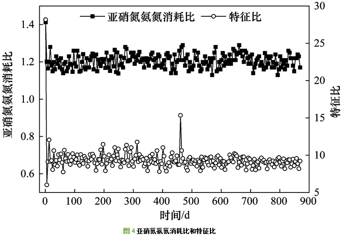 反應器改為連續進水出水的第1 d, 總氮去除率為13.8%.但亞硝氮氨氮消耗比為1.41, 特征比為28.17, 不滿足厭氧氨氧化方程式.分析其原因, 可能是由于火山巖填料對基質的吸附作用.隨著吸附達到飽和, 總氮去除率明顯降低, 第4 d時, 總氮去除率由13.8%降低到5.2%.反應器繼續運行, 氨氮和亞硝氮去除效果逐漸提高, 出水硝氮濃度逐步增加.第109 d時, 連續15 d氨氮和亞硝氮去除率大于90%, 總氮去除率大于70%, 亞硝氮氨氮消耗比穩定在1.17~1.26, 特征比穩定在8.76~10.21, 符合厭氧氨氧化反應方程式, 表明上向流厭氧氨氧化生物濾柱啟動成功.