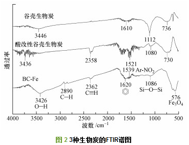 圖 2為3種生物炭的FTIR譜圖.由圖可知, 硝酸改性和負磁后的谷殼生物炭明顯比未改性的谷殼生物炭表面的官能團豐富.BC-Fe在3426 cm-1左右出現(xiàn)較寬的吸收峰且有延伸, 表明在磁性鐵顆粒作用下生物炭大量締合—OH, 這與負磁方法中聚乙二醇以氫鍵與Fe3O4顆粒表面結(jié)合相符;2890 cm-1左右新增C—H的伸縮振動峰;在2362 cm-1左右出現(xiàn)了C≡N的特征吸收峰, 1539 cm-1左右出現(xiàn)的較強的峰則是Ar—NO2的特征峰(Ar指含有芳環(huán)的基團), 表明硝酸改性以不同形式增加了BC-Fe表面的官能團;1620 cm-1及1520 cm-1左右出現(xiàn)了芳環(huán)及C C的伸縮振動峰;1086 cm-1左右的是Si—O—Si反對稱伸縮振動峰;576 cm-1左右是Fe3O4的特征峰位置, 表明生物炭成功負載磁性.由此可知, 硝酸改性和負磁增強了芳環(huán)、羥基等基團的作用, 同時使BC-Fe新增了C—H、C≡N、Ar—NO2等基團及Fe3O4納米顆粒, 增加了谷殼生物炭表面官能團的種類和豐度, 為重金屬離子以共軛、氫鍵等作用力與BC-Fe結(jié)合提供更多可能.同時, 含氧官能團含量相對較多也使得吸附劑的快速吸附位點增加, 促進了BC-Fe對重金屬離子的快速吸附, 大大提高了谷殼生物炭對重金屬離子的吸附能力.