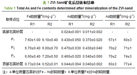 實驗結束后, 分別收集R1和R2填充柱底部和頂部石英砂層及中部ZVI-Sand填充層固體, 將ZVI-Sand填充層均分為3個部分(P1、P2和P3).將固體放置在60 ℃的真空干燥箱中干燥24 h, 取出置于干燥器中冷卻.稱取0.5 g固體于50 mL比色管中, 加入10 mL新配制的王水(1+1), 在90 ℃恒溫水浴中酸化30 min后取下, 待溶液冷卻至室溫后轉移至50 mL容量瓶中并用去離子水定容搖勻.靜置待沉淀完全后, 吸取上層清液測定總砷及總鐵.
