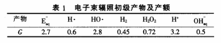 對(duì)pH=7的純水來(lái)說(shuō),其輻照初級(jí)產(chǎn)物及產(chǎn)額G(當(dāng)吸收100eV的電子束輻照能量時(shí)形成或分解的自由基、原子、離子或分子的數(shù)目)如表1所示。
